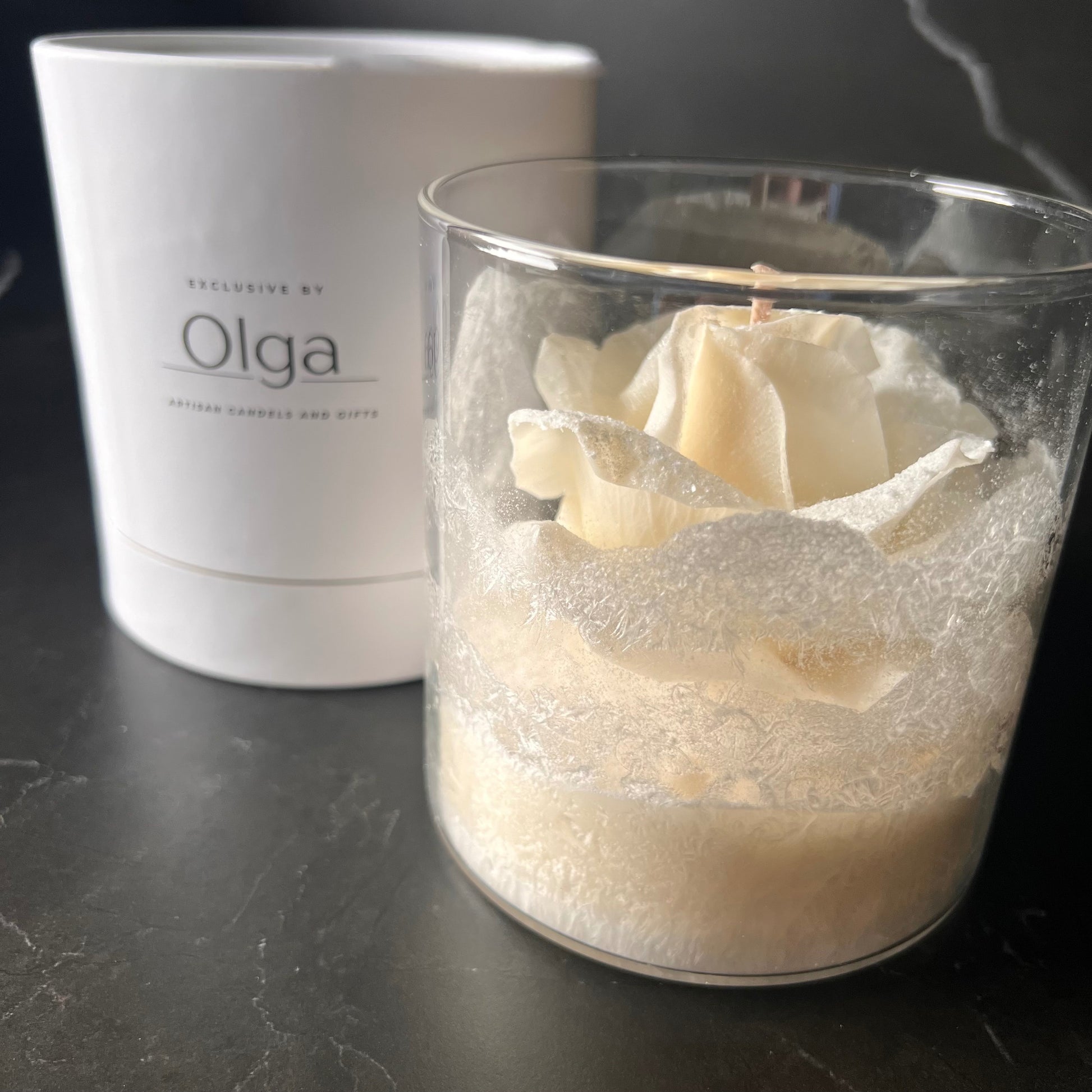 Entdecke die Gefrorene Signature Rose-Kerze von Exclusive by Olga – ein Meisterwerk aus Liebe, Natur und Handwerkskunst.